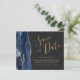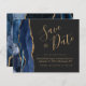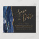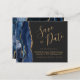 This elegant budget save the date card features a navy blue watercolor agate border trimmed with faux gold glitter. The customizable text combines gold colored handwriting script, copperplate and italic fonts on a charcoal gray background. The reverse side features a matching navy blue and gold agate design. NOTE: Envelopes are not automatically included with these budget invitations, so please remember to choose the "blank white envelopes" option!
