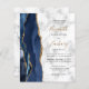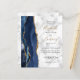The left-hand edge of this elegant modern wedding invitation features a navy blue watercolor agate border trimmed with faux gold glitter. The customisable text combines gold-coloured handwriting with black copperplate and italic fonts on a white and grey marble background. The reverse side provides space for wedding details on a marble background, along with a QR code guests can scan to visit your website and RSVP, which saves the cost of printing and mailing separate RSVP cards.