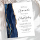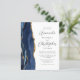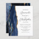 The left-hand edge of this elegant modern wedding invitation features a navy blue watercolor agate border trimmed with faux gold glitter. The customisable text combines charcoal grey script and sans serif fonts on a white background. The reverse side features a matching navy blue and gold agate design.