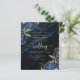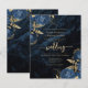 This elegant wedding invitation features blue floral bouquets set off with gold faux foil greenery in two corners, on a background image of navy blue watercolor agate. The customisable text combines gold-coloured serif, italic and handwriting fonts. The reverse side features a matching navy blue and gold floral and agate design.