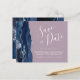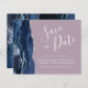This elegant budget save the date card features a navy blue watercolor agate border trimmed with faux silver glitter. The customisable text combines white handwriting script, copperplate and italic fonts on a mauve purple background. The reverse side features a matching navy blue and silver agate design.