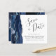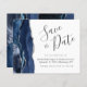 This elegant budget save the date card features a navy blue watercolor agate border trimmed with faux silver glitter. The customizable text combines charcoal gray handwriting script, copperplate and italic fonts on a white background. The reverse side features a matching navy blue and silver agate design. NOTE: Envelopes are not automatically included with these budget invitations, so please remember to choose the "blank white envelopes" option!