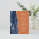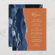 The left-hand edge of this elegant modern wedding menu features a navy blue watercolor agate border trimmed with faux silver glitter. The customisable text combines handwriting and copperplate fonts in silver grey on a burnt orange background. The reverse side features a matching navy blue and silver agate design.