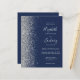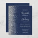 The left-hand edge of this elegant modern wedding invitation features a silver faux glitter border. The customisable text combines silver grey handwriting, copperplate and italic fonts on a navy blue background. Add additional details on the back, along with a QR code to help your guests visit your wedding website.