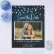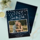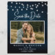 Budget Navy Blue Wood Lights Photo Save the Date - A dramatic, navy blue rustic wood background with photo and glowing string lights hanging overhead. The back of the announcement, includes a QR code. If you prefer not to have the QR code you can simply delete that layer. Part of a collection.