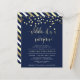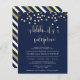 Budget Navy Gold Confetti Surprise Birthday Party Invitations by Eugene Designs. Send these elegant navy and gold invitations and start your surprise party with a modern message. On the front, in stylish handwritten style script are the words "shhh.. it's a surprise" in faux gold foil. On the reverse, there are sleek diagonal stripes in the same golden brown colours as the polka dot confetti on the front. Blocked white serif fonts communicate the details of your surprise party with maximum clarity.
