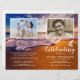 Budget funeral dove memorial program featuring an all over ocean picture background, on the front a photo of the deceased, their name, dates, the memorial venue, date of the event. On the inside is an obituary, and order of service; and on the back another photo, a thank you note and the second venue for after the funeral. PLEASE NOTE: These come as a flat piece of quality paper, you will need to fold them yourself.