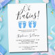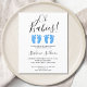 This budget twin baby boys baby shower invitation is decorated with modern typography and cute watercolor baby's feet in pastel blue.