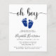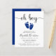 Cute budget-friendly baby boy shower invitation with "oh boy" in a stylish script with swashes and a navy blue watercolor of baby feet.