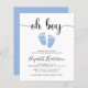 Cute budget-friendly virtual baby boy sprinkle invitation with "oh boy" in a stylish script with swashes and a pastel blue watercolor of baby feet. Underneath you can easily personalise the baby sprinkle shower details.