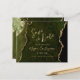 This elegant wedding save the date card features a background image of olive green watercolor agate trimmed with faux gold glitter. The customisable text combines gold-coloured modern handwriting, copperplate and italic fonts. The reverse side features a coordinating olive green and gold agate design.