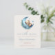 This cute boho baby shower invitation features a sweet watercolor teddy bear asleep on a blue crescent moon decorated with blue flowers, above the words "over the moon" in blue handwriting script. Personalise the text with the name of the mum-to-be in script and the details in sans serif font on a beige background. The reverse side provides space for diaper raffle, books for baby, and registry details, along with a convenient QR code guests can scan to visit the registry. Ideal for a boy's baby shower.
