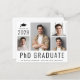 Budget-friendly modern PhD doctorate degree graduation announcement and party invitation featuring a 4 picture photo collage, "PhD Graduate" written across the bottom in large capital letters and his or her class year, name and college or university in simple typography. On the reverse side, add the grad party details.