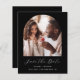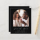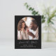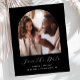 This simple, minimalist Save the Date card features a boho photo arch above the words "Save the Date" in elegant white handwriting script, followed by the couple's names, wedding date and city in sans serif font on a black background. Add a more detailed message with additional information on the reverse.