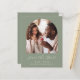 This simple, minimalist Save the Date card features a boho photo arch above the words "Save the Date" in elegant white handwriting script, followed by the couple's names, wedding date and city in sans serif font on a sage green background. Add a more detailed message with additional information on the reverse.