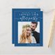 Modern classic blue budget-friendly elopement / private wedding announcement and reception save the date featuring your photo and "Save The Date For Our Happily Ever After Party" in modern white typography and a chic white script with swashes. Add your first names, reception date and location. On the back, personalise your marriage announcement and reception save the date details.