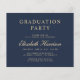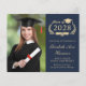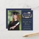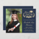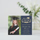 Modern dark blue budget-friendly college graduation announcement and party invitation with "Class of" and the year within a laurel wreath, a grad cap and a diploma, a photo of the graduate and their name in an elegant light gold script. Add their school, major, honours or future plans. On the reverse side, add the party details.