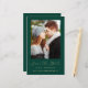 This simple, minimalist Save the Date card features a vertical photo above the words "Save the Date" in elegant gold-coloured handwriting script, followed by the couple's names, wedding date and city in sans serif font on an emerald green background. Add a more detailed message with additional information on the back, along with a QR code your guests can use to visit your wedding website.