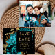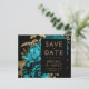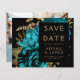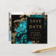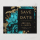 This elegant, moody wedding Save the Date card features a lush, romantic floral bouquet in turquoise with gold faux foil and glitter foliage on a black background. Customise the gold-coloured text in stylish fonts on a black rectangle, and add your favourite horizontal photo to the back.