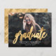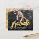 Modern graduation announcement featuring a custom horizontal photo. The word "graduate" appears in gold faux foil script, with the graduate's name, school, and year of graduation below in white sans serif font. Easily replace the sample image with your own graduate's photo. A black gradient screen helps ensure the text pops. The reverse features a pattern of gold faux foil polka dots. Ideal for high school or college graduation.