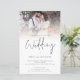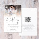 PLEASE NOTE there is ONE invite per sheet. Budget Photo Overlay QR Code Script Wedding Invitation. A LARGER size 5.5” x 8.5” at a budget price,. PLEASE NOTE THE OPTIONAL ENVELOPES ARE A LITTLE BIGGER IN SIZE AT 6.75” x 9” approx. With a QR code to your wedding website on the back so your guests can RSVP and see all the details online without the need for separate enclosures. Your QR code will be automatically generated to update the sample code in the design, when you simply change the sample URL in the template with your own wedding website URL. An informal set typography in black for the main heading Wedding complementing the rest of the text which you can easily personalise. Replace the sample photo with your own favorite.