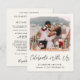 Chic light cream budget-friendly elopement or private wedding announcement and post-wedding reception party invitation. The front features your photograph, "Celebrate With Us" in an elegant script and your first names and wedding date and location in simple modern typography. On the back, personalise your wedding or elopement announcement in more detail, add a reception or party invitation, input your wedding website's URL address to create a QR code for your guests to scan for more information and to RSVP online, and add your names in a signature-like script. This budget semi-gloss paper is similar in weight to photo paper. A larger 5x7 traditional card stock version is also available (message us for the link).