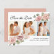 Three of your couple's photos are placed in a band at the centre of the save the date card. Dusty pink roses on sage green eucalyptus leaves provide a diagonal floral accent. Save the Date is written in a formal script in the upper right corner. Your names, wedding date and location are in the bottom right corner.