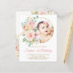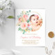 Blush Pink flowers baby’s first birthday invitation featuring green eucalyptus leaves & pink watercolor roses and golden wreath