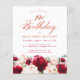 Red roses and blush pink peonies are nestled in dark green leaves on this beautiful and unique birthday invitation.