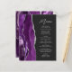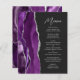 This elegant modern wedding menu features a purple watercolor agate border trimmed with faux silver glitter. The customisable text combines silver grey handwriting script and sans serif fonts on a slate black background. The purple and silver agate design is repeated on the reverse side.