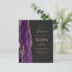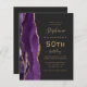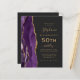 The left-hand edge of this elegant modern 50th birthday party invitation features a purple watercolor agate border trimmed with gold faux glitter. The customisable text combines gold-coloured handwriting, copperplate and italic fonts on a slate black background. Add RSVP instructions on the back of the card, along with a QR code guests can scan to respond online.