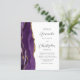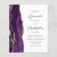 The left-hand edge of this elegant modern wedding invitation features a purple watercolor agate border trimmed with faux gold glitter. The customisable text combines charcoal grey script and sans serif fonts on a white background. The reverse side provides space for wedding details on a solid white background, along with a QR code guests can scan to visit your website and RSVP, which saves the cost of printing and mailing separate RSVP cards.