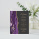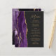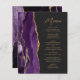 The left-hand edge of this elegant modern wedding menu features a purple watercolor agate design trimmed with faux gold glitter. The customisable text combines gold-coloured handwriting script and sans serif fonts on a dark slate black background. The purple and gold agate design is repeated on the reverse side.