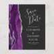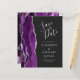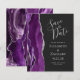 The left-hand edge of this elegant modern wedding save the date card features a purple watercolor agate border trimmed with faux silver glitter. The customisable text combines silver grey handwriting and copperplate fonts on an off-black background. The reverse side features a matching purple and silver agate design.