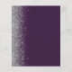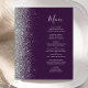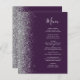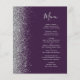 The left-hand edge of this elegant modern wedding menu features a silver faux glitter border. The customisable text combines silver grey handwriting script and copperplate fonts on a dark purple background. The reverse side features a matching purple and silver design.