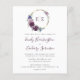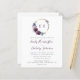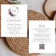 This wedding design features the bride and groom's monogram initials in dark purple framed by a watercolor wreath of purple flowers on a gold faux foil circle. Personalise the text with the couple's names in elegant dark purple handwriting script and the wedding details in charcoal grey. The reverse side provides space for wedding details on a solid white background, along with a QR code guests can scan to visit your website and RSVP, which saves the cost of printing and mailing separate RSVP cards.