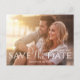 An elegant simple Save the Date postcard with a QR code photo budget simple, elegant template calligraphy script, wedding website details information, with a scan scannable QR code URL, wedding budget postcard size, white lettering typography style, stylish trendy full bleed photo, couple engaged engagement picture, elegance simplistic photo overlay, minimal minimalist modern style