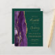 The left-hand edge features a purple watercolor agate border trimmed with gold faux glitter. The customisable text combines gold-coloured handwriting, copperplate and italic fonts on an emerald green background. The reverse side provides space for wedding details on a solid emerald green background, along with a QR code guests can scan to visit your website and RSVP, which saves the cost of printing and mailing separate RSVP cards.