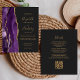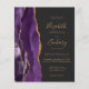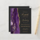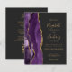 The left-hand edge features a purple watercolor agate border trimmed with gold faux glitter. The customisable text combines gold-coloured handwriting, copperplate and italic fonts on a slate black background. The reverse side provides space for wedding details on a solid slate black background, along with a QR code guests can scan to visit your website and RSVP, which saves the cost of printing and mailing separate RSVP cards.