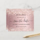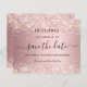 A Save the Date card for a Quinceañera, 15th birthday party. A blush pink metallic looking background decorated with rose gold faux glitter dust. Personalize and add a date and name/age. The text: Save the Date is written with a large trendy hand lettered style script with swashes.