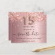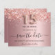 A girly and trendy Save the Date card for a Quinceañera, 15th birthday party. Blush pink faux metallic looking background decorated with faux glitter dust. Personalise and add a date and name/text. The text: Save the Date is written with a large trendy hand lettered style script with swashes. Number 15 with rose gold coloured balloon style font.
