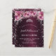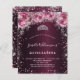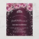 A modern, stylish and glamourous invitation for a Quinceañera, 15th birthday party. A burgundy faux metallic looking background with pink faux glitter dust, a tiara crown and pink florals. The name is written with a modern hand lettered style script. Personalise and add your party details.