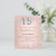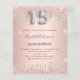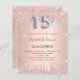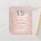 A modern, stylish and glamourous invitation for a girl's Quinceañera, 15th birthday party. A faux rose gold metallic looking background with faux rose gold and silver glitter. The name is written with a modern dark rose gold coloured hand lettered style script. Personalise and add your party details. Number 15 is written with a silver balloon style font, script.