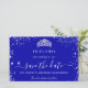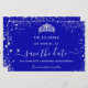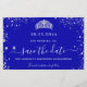 A girly and trendy Save the Date card for a Quinceañera, 15th birthday party. A royal blue coloured background. Decorated with faux silver glitter dust and a tiara, crown. The text: Save the Date is written with a large trendy hand lettered style script.