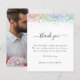 A value for money BUDGET alternative on a smaller size 4.5 x 5.6” semi-gloss 110lbs weight, which is of similar thickness to a postcard (however is not suitable to use as a postcard.). PLEASE NOTE there is ONE invite per sheet. Budget Rainbow Glitter Photo Wedding Thank You. A touch of glam with a faux glitter border at the top and an elegant script with swashes for Thank You. On the back replace the sample picture with your own favourite from your day as a keepsake for your guests. Easily personalise the rest of the text with your message and names.