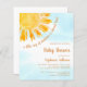 This budget baby shower invitation features the text "A little ray of sunshine is almost here!" with a watercolor yellow sun and blue sky.