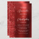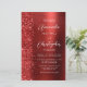 The left-hand edge of this elegant modern wedding invitation features a red faux glitter border. The customisable text combines white handwriting, copperplate and italic fonts on a red faux brushed metal background. The reverse side features a matching glitter and brushed metal design.