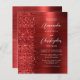 The left-hand edge of this elegant modern wedding invitation features a red faux glitter border. The customisable text combines white handwriting, copperplate and italic fonts on a red faux brushed metal background. The reverse side provides space for wedding details on a red brushed metal background, along with a QR code guests can scan to visit your website and RSVP, which saves the cost of printing and mailing separate RSVP cards.