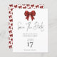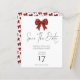 Budget Red Glitter Coquette Bow Christmas Party Save the Date.. A budget priced, smaller size 4.5 x 5.6” semi gloss similar in thickness to a postcard. There is ONE per sheet,. Sparkle to invite your festive guests with a faux glitter bow and coordinating pattren on the other side on classic black. A stylish informal set script for Save the Date and the rest of the text you can easily personalise.