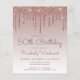 This trendy 50th birthday invitation features a sparkly rose gold faux glitter drip border and ombre background. The words "50th Birthday" and the name of the guest of honour appear in dark rose casual handwriting script, with the rest of the customisable text in sans serif font. The same rose gold glitter drip design appears on the reverse side.